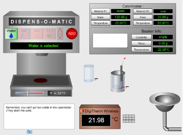 Experiment with calorimetry without the mess. Investigate phase and temperature changes using various solids and variable temperature water.